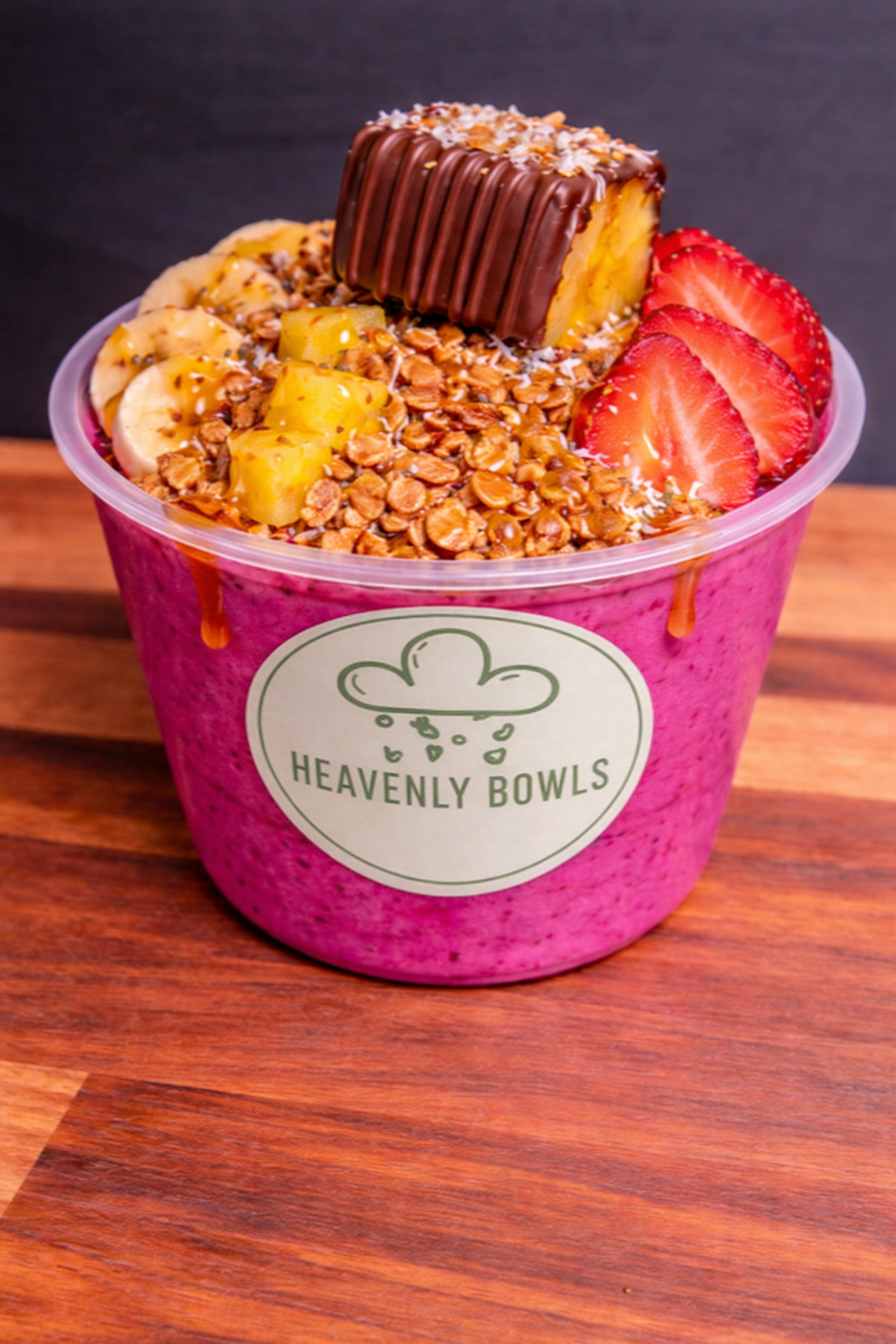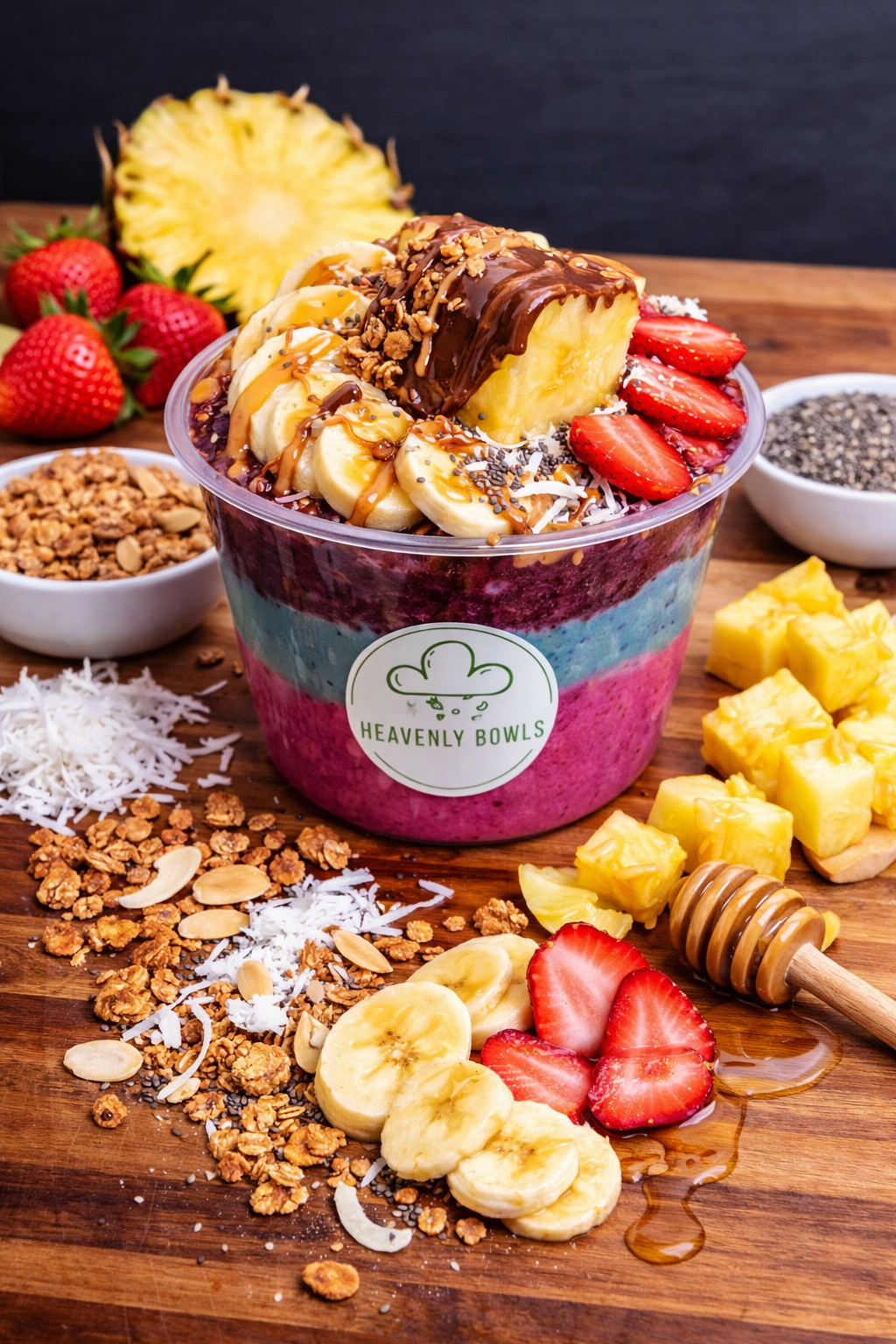 Pitaya sorbet topped with freshly sliced banana, juicy pineapple, and sweet strawberries, complemented by crunchy homemade granola, coconut shavings, nutrient-rich chia seeds, and a light honey drizzle.