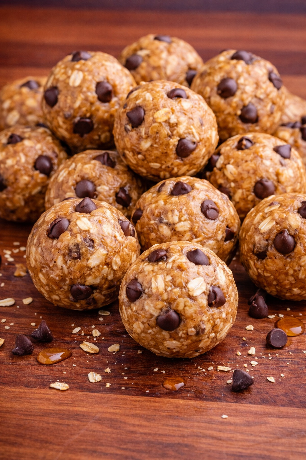 These protein balls combine creamy peanut butter, rolled oats, honey, and protein powder with the added crunch of chia seeds and chocolate chips for a chewy texture.