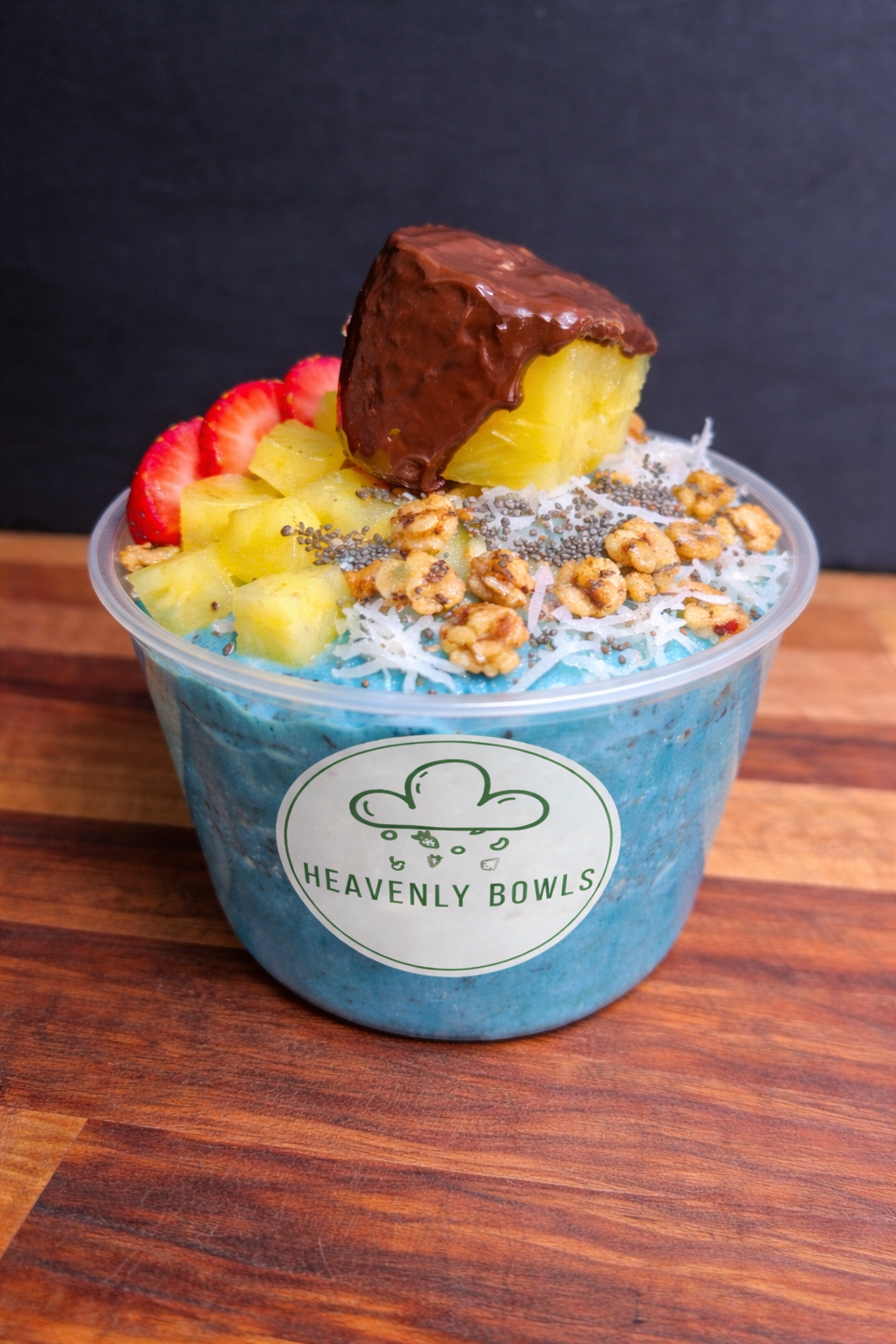 Blue spirulina sorbet complemented by juicy pineapple and fresh strawberries. It is finished with a topping of crunchy homemade granola, coconut flakes, and chia seeds for added texture and nutrition.
