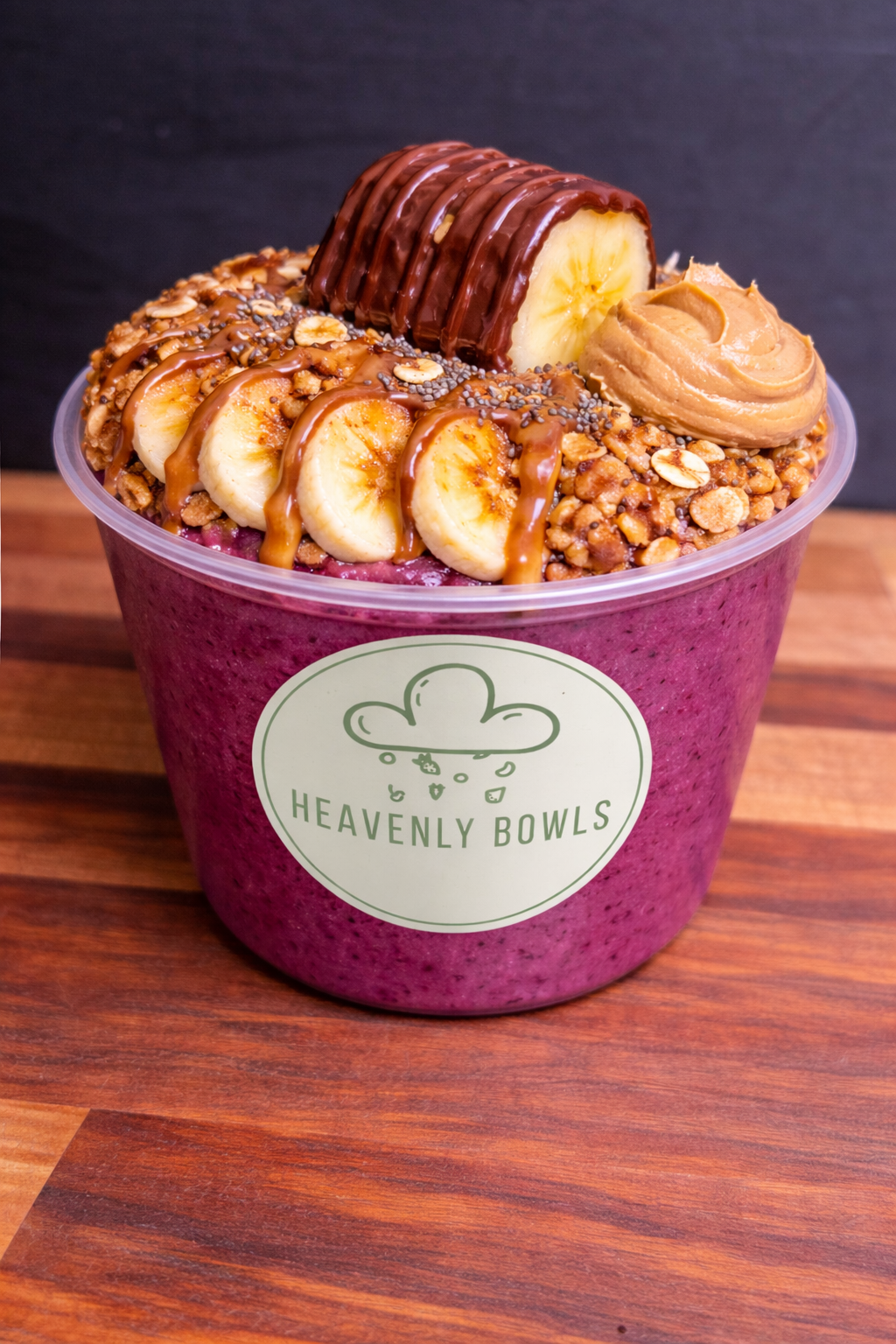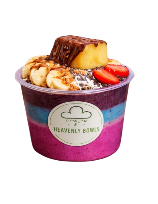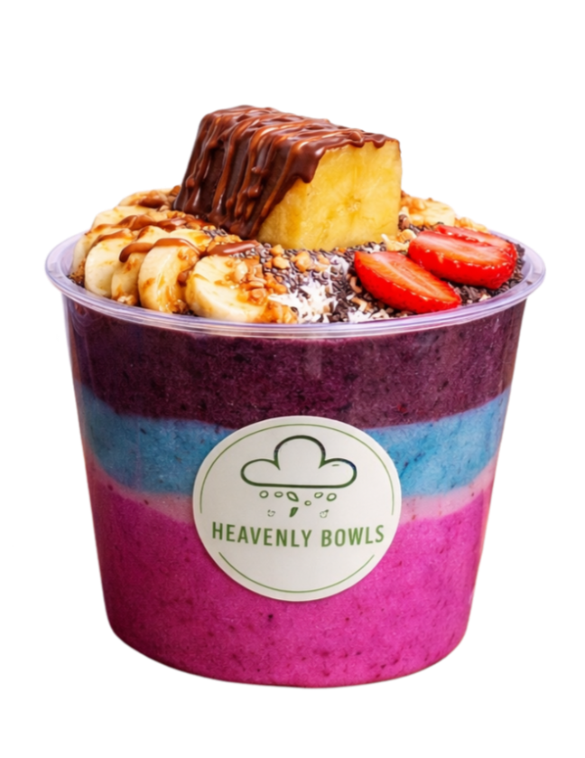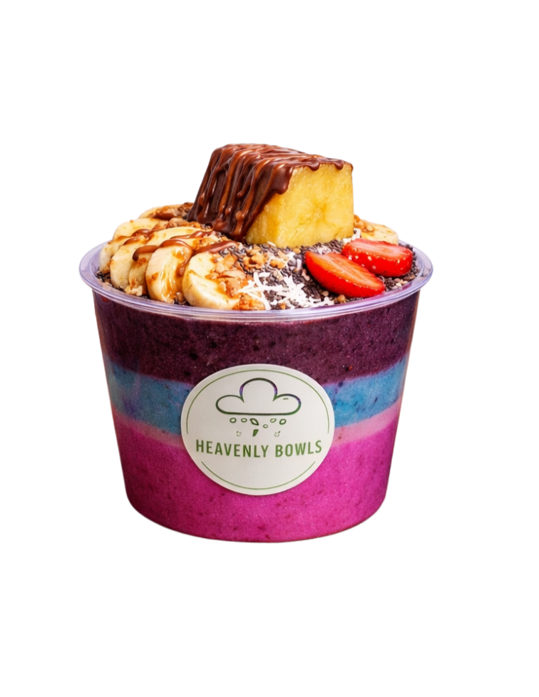 Açai sorbet base topped with fresh banana slices, crunchy sliced almonds, and a dollop of peanut butter, complemented by homemade granola and chia seeds. Finished with delicious chocolate and peanut butter drizzle.