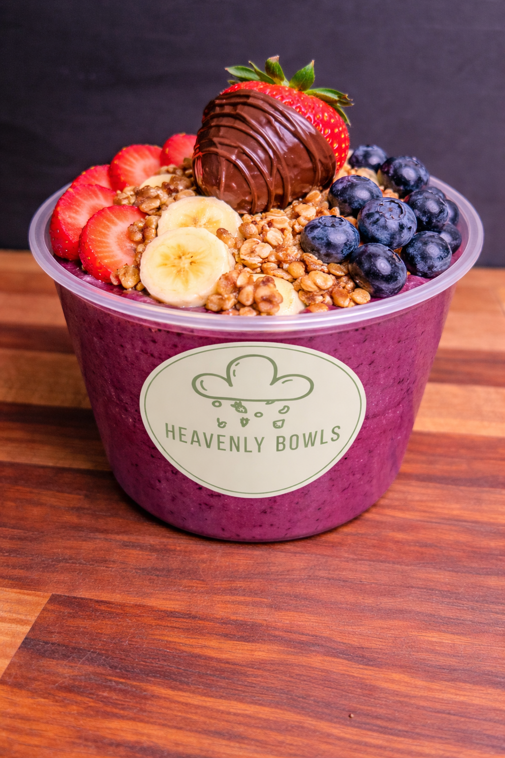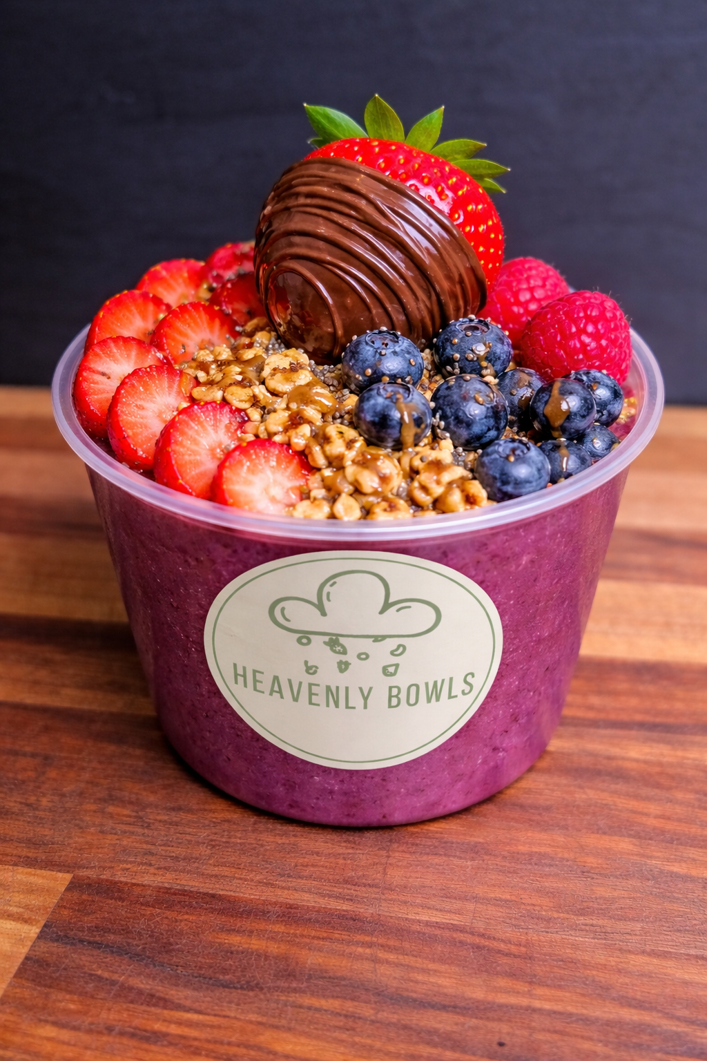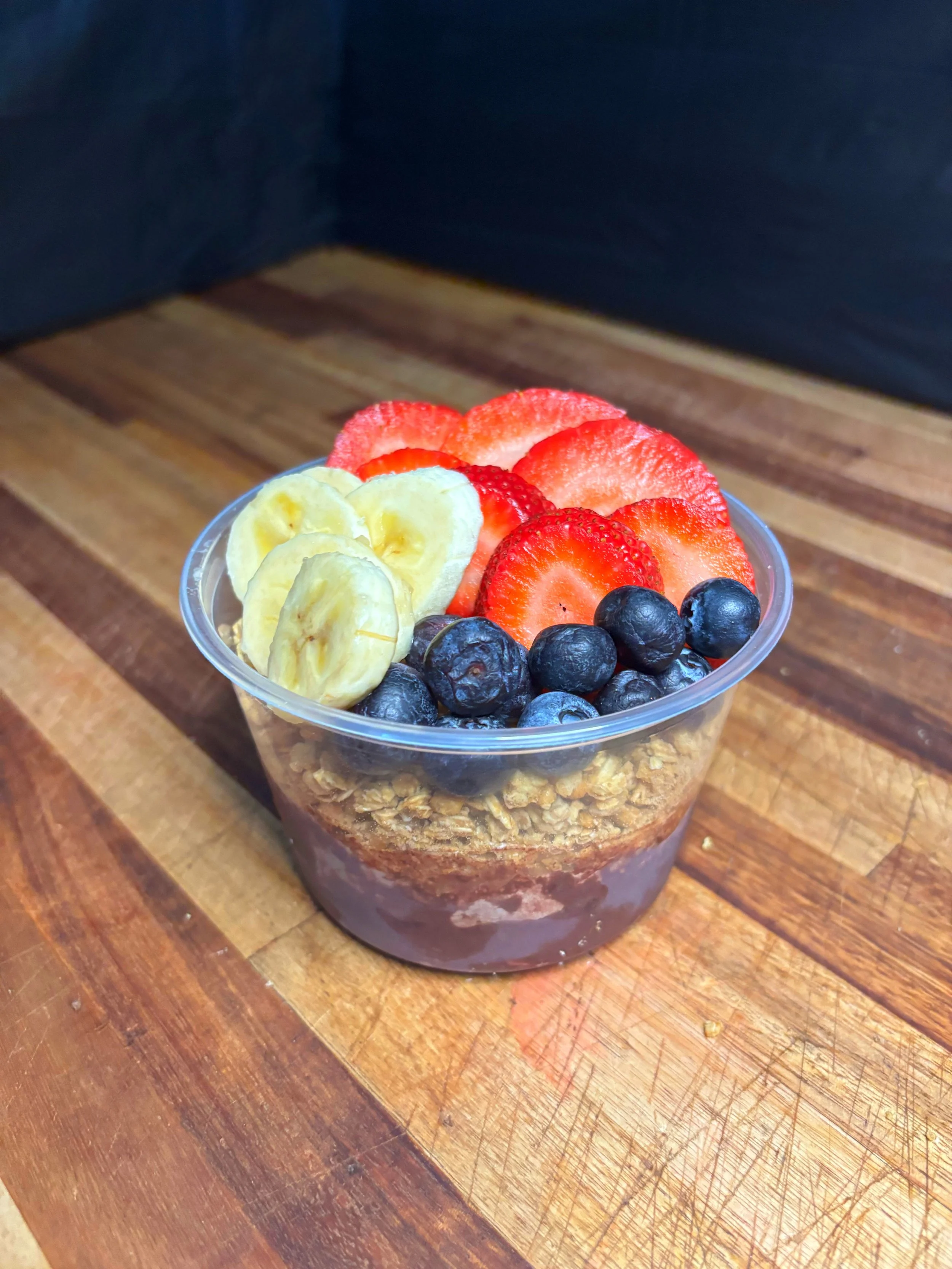 Açai sorbet base topped with fresh banana slices, crunchy sliced almonds, and a dollop of peanut butter, complemented by homemade granola and chia seeds. Finished with delicious chocolate and peanut butter drizzle.