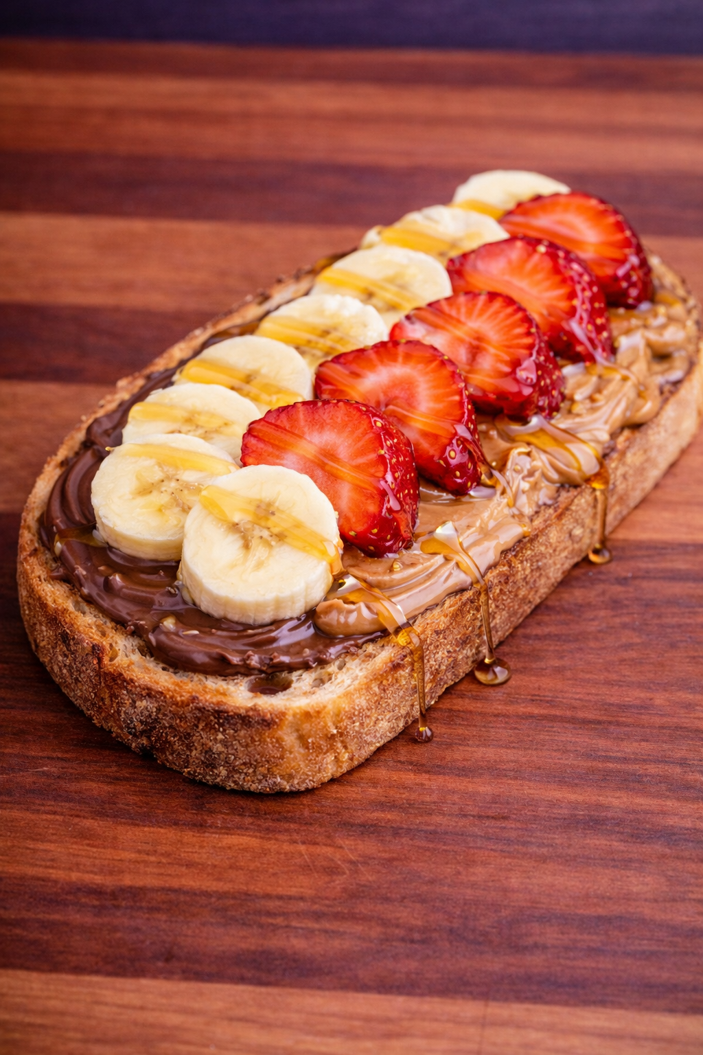 Toasted sourdough bread spread with creamy Nutella and rich peanut butter, topped with sliced banana, fresh strawberries, and a drizzle of honey for a sweet finish.
