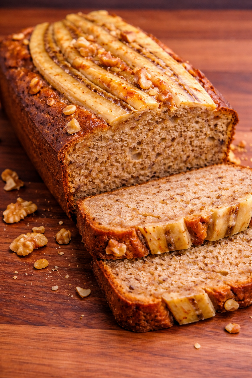 Homemade banana bread featuring ripe bananas and crunchy walnuts, offering a moist texture and rich flavor. This delicious bread is a delightful source of protein and a perfect treat for any time of the day.
