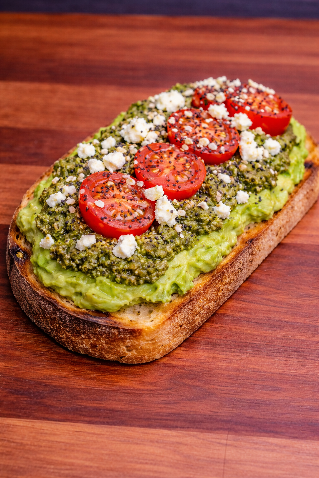 Creamy fresh avocado spread on toasted sourdough bread, topped with zesty pesto, crumbled feta, juicy tomatoes, and a sprinkle of everything but the bagel seasoning.